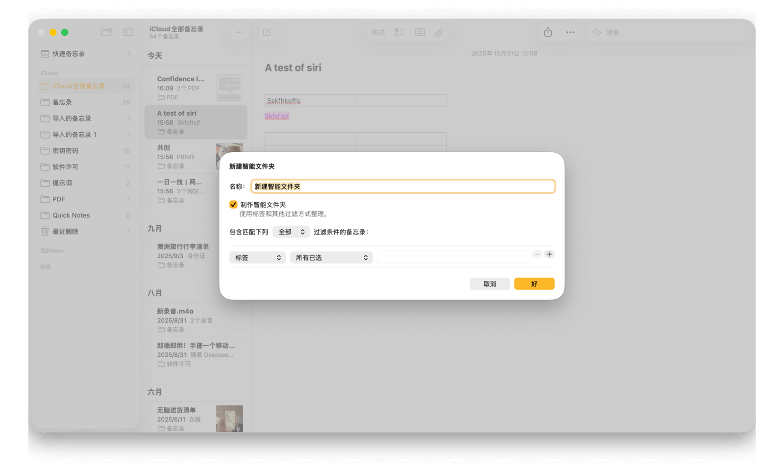 如果某个标签下的内容过多,也可以直接在标签页面中将其转换成智能文件夹。之后,该智能文件夹将自动按你选择的标签筛选备忘录,无须重复操作。