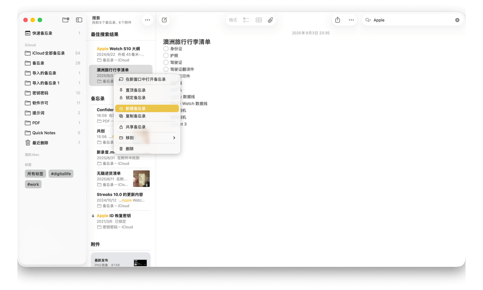 此外,你还可以将备忘录导出为 PDF 文件,只需选中想要导出的备忘录,点击「菜单栏 > 文件 > 导出为 PDF」即可。