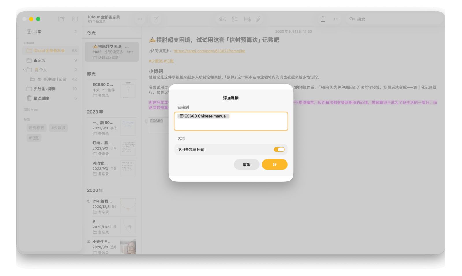 在备忘录中使用双向链接的方式与其他笔记应用不同,它没有专门的菜单选项或触发词,而是通过「添加链接」的入口实现。选中需要添加双向链接的文本,在右键菜单中选择「添加链接」或使用键盘快捷键「⌘Command + K」。在弹出的窗口中,于「链接到:」一栏直接输入想链接的备忘录标题,备忘录会根据关键词匹配建议,选中后点击「好」即可完成创建。