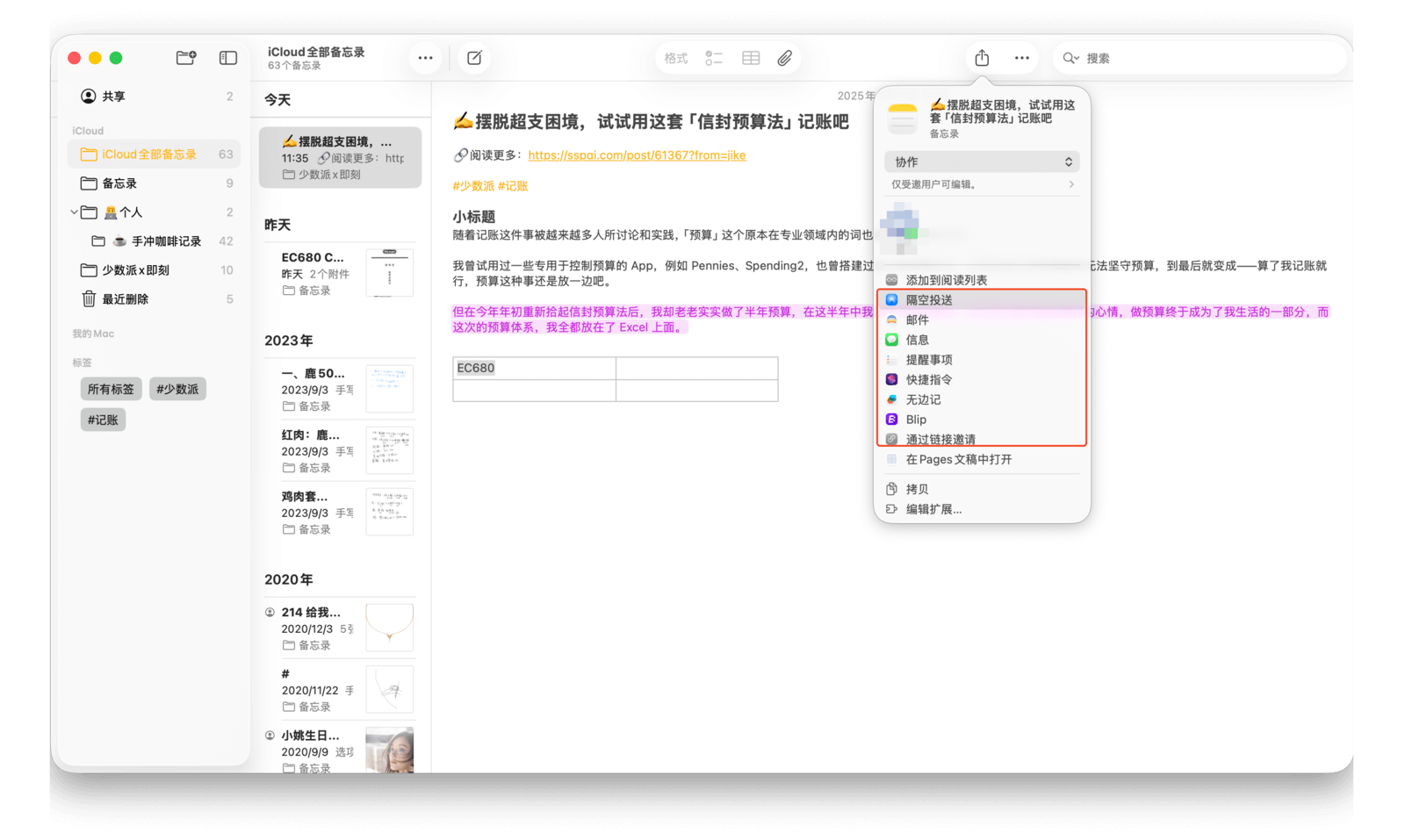 除了用文件夹分类,你还可以为单个备忘录添加「标签」来分类。创建备忘录时,只要写上「# + 标签名 + 空格/回车」,例如「#稿子」「#美食」,就可以添加标签。所有的标签都会显示在边栏的标签浏览器中,支持通过点选单个或多个标签来筛选备忘录。