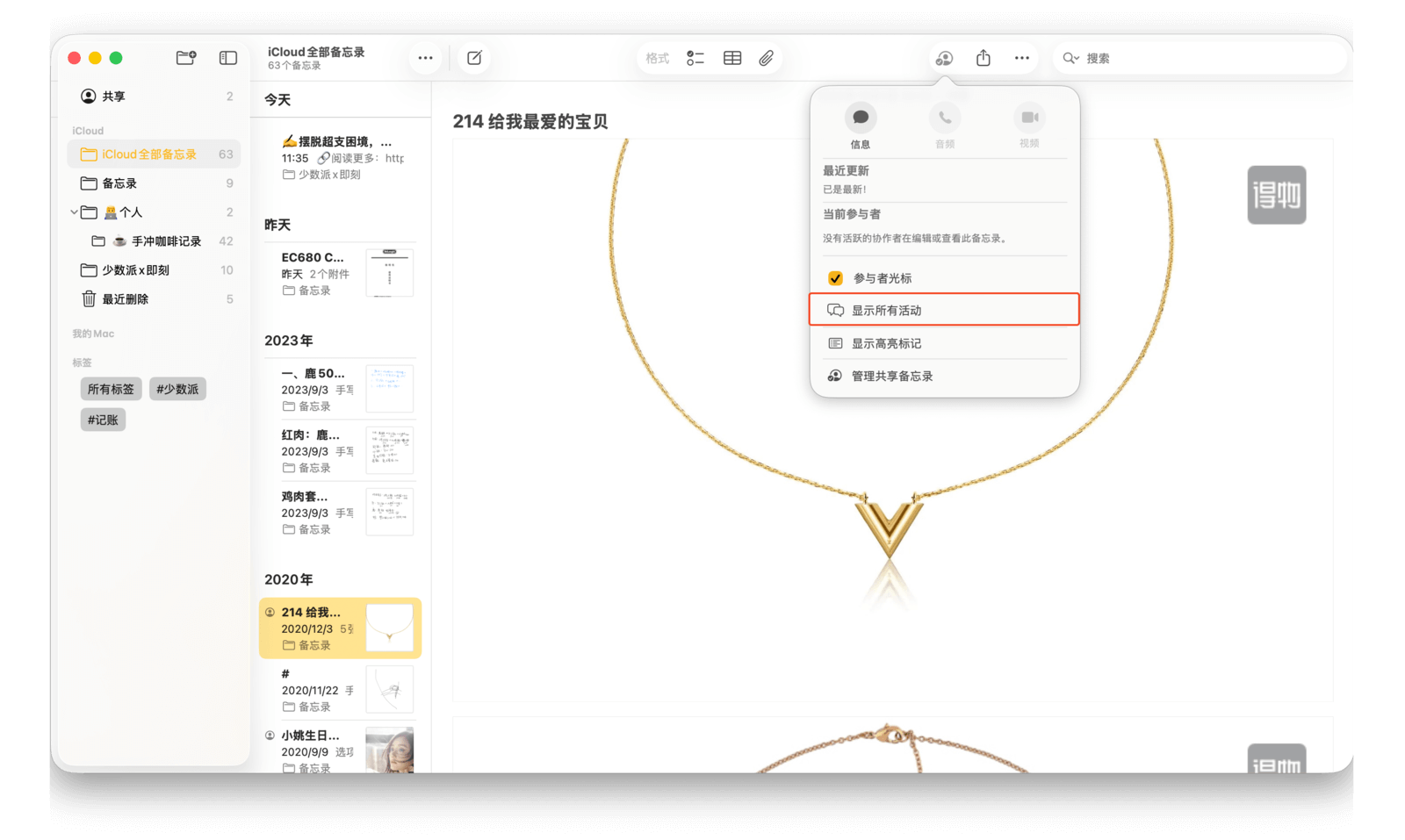 备忘录共享后,只需点击右上角的头像按钮,即可看到以不同颜色高亮显示的更新内容、修改人以及修改日期等信息。在共享设置中打开「显示所有活动」,此时备忘录会直接以高亮形式展示历史变动,这项功能可以帮你迅速理清更新内容。
