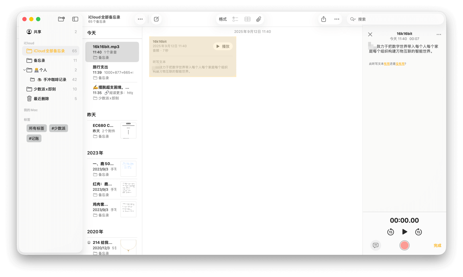 苹果在 Mac 上充分利用本地机器学习的能力,可以在备忘录 App 中直接将导入的音频转译为文本。例如,语音备忘录中的录音、电话中的语音留言等,都可以先通过共享菜单添加到备忘录中,然后双击音频卡片,再点击音频播放详情页面中左下方的按钮,就可以看到音频已被转换成文字。