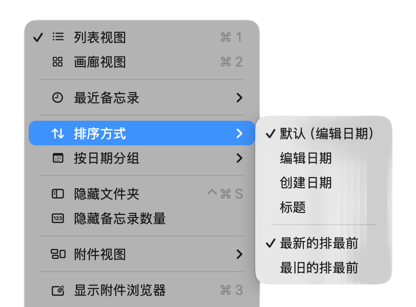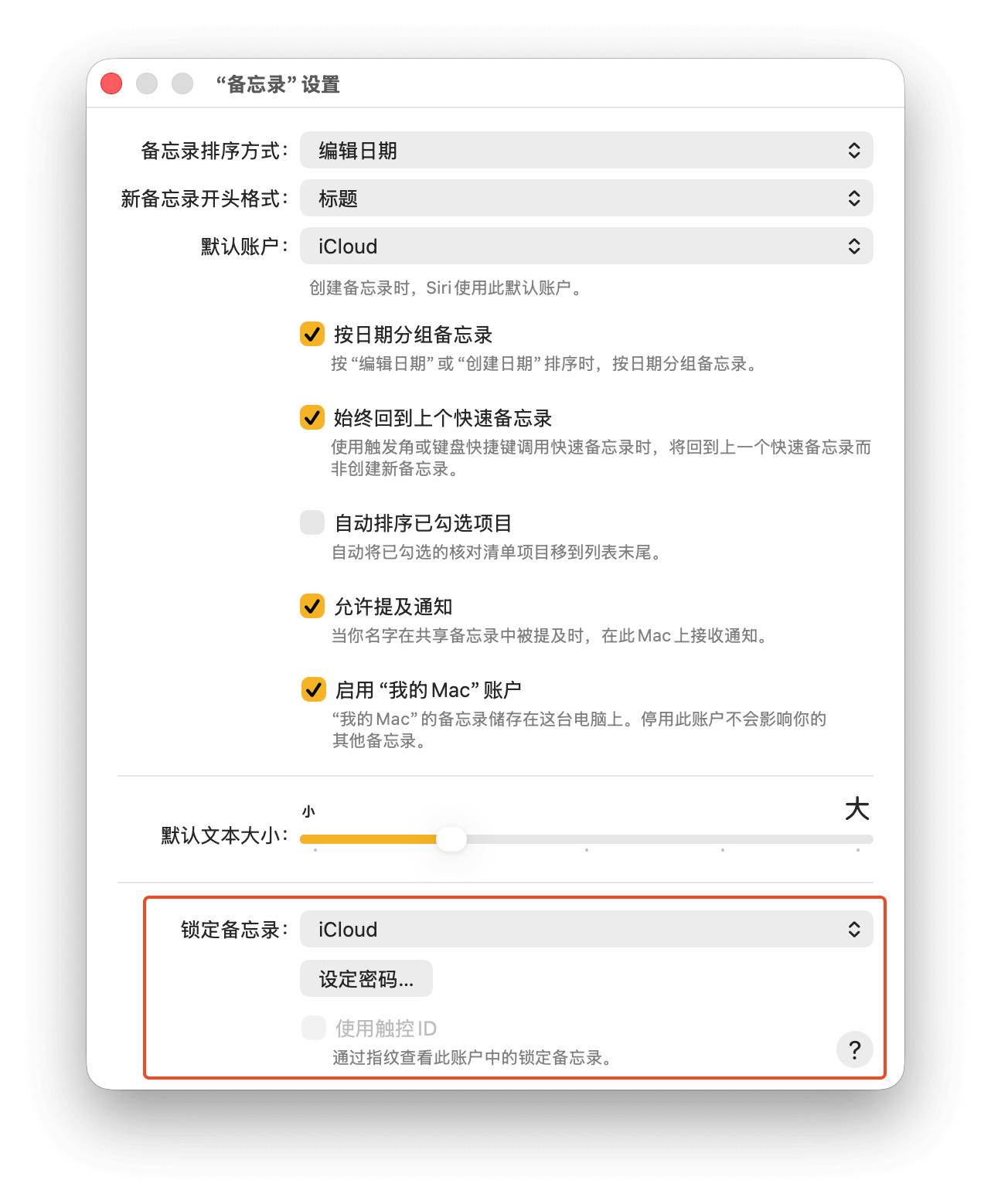 在「菜单栏 > 备忘录 > 设置」里,你还可以进行更多个性化设置,例如备忘录的排序方式、新备忘录的开头格式、默认账户以及默认文本大小等。