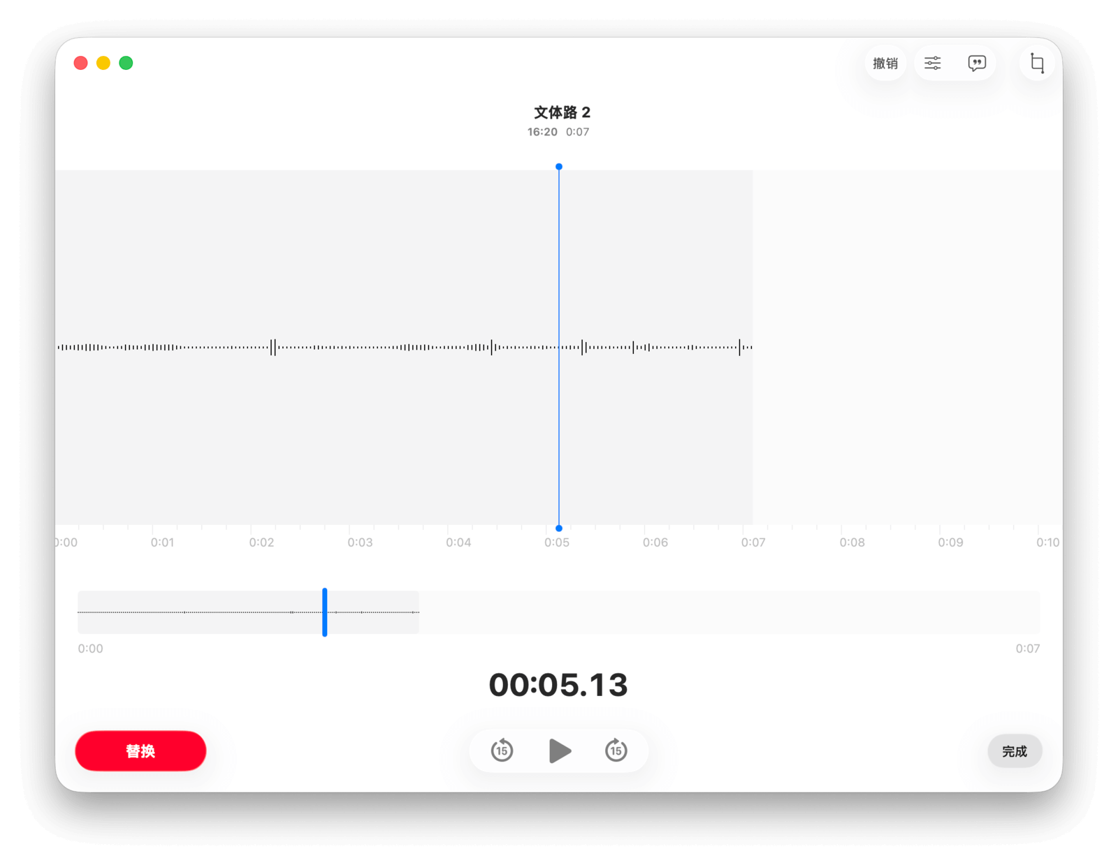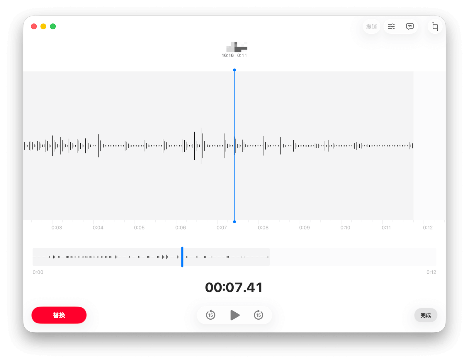 与录制时的操作一样,将进度条移动到要替换部分的开头处,点击「替换」即可重录语音。被替换部分的音波会变成红色,原来的则保持黑色。
