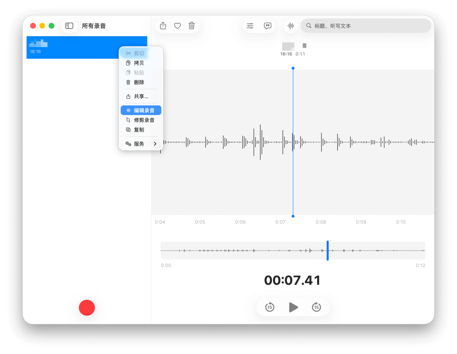 选中需要修改的录音,点击右上角的「编辑」按钮,就会进入这条录音的编辑界面。