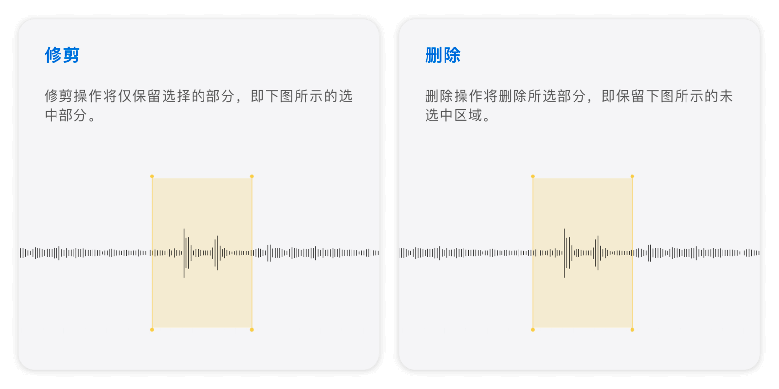 在这个界面中,你可以看到缩微波形图的两端出现了带箭头的黄色控制柄。将控制柄的两端分别移动到待删除部分的开头和结尾处,便可以选择「修剪」或「删除」。编辑完成后,可以选择「取消」或「存储」操作。