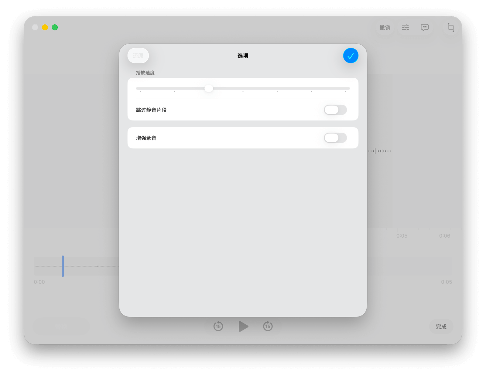 退出修剪界面后,点击右上角的选项按钮,就可以调整语音的播放速度。向「乌龟」符号移动是减慢,向「兔子」方向移动则是加速。目前只能按应用提供的档位调整播放速度。除此之外,语音备忘录还提供了「跳过静音」的选项,勾选后会自动跳过语音文件中的静音部分,此操作可以还原。而「增强录音」选项则可以让录音中的人声更加清晰。