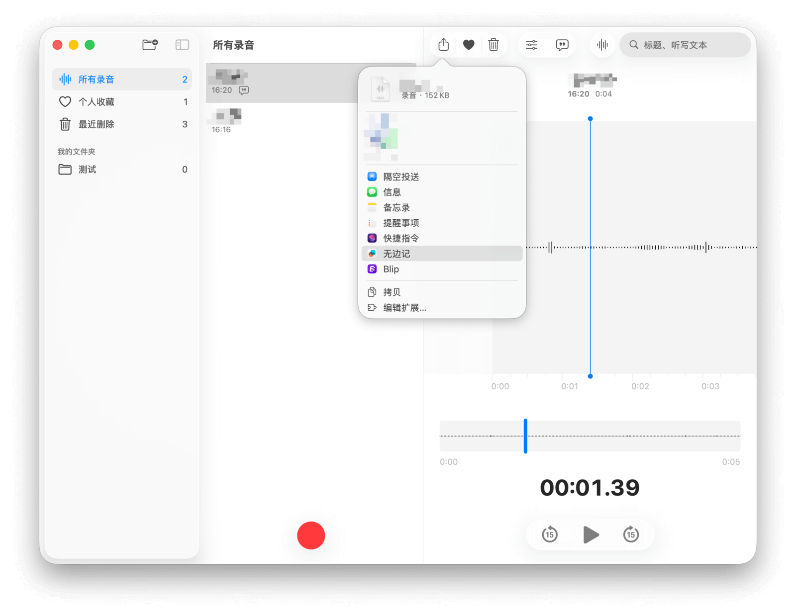 如果想要将语音备忘录共享给他人或发送到其他软件,只需选择要共享的录音,点击右上角的「共享」符号,然后选择共享方式或目标 App 即可。例如,你可以通过「隔空投送」发送给附近的朋友,或者将文件作为附件用邮件发送、分享到微信等。