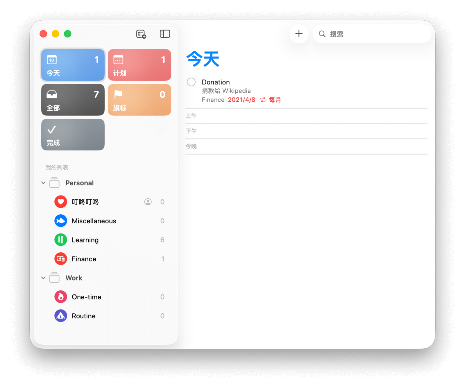 在应用主界面,左侧边栏是系统自带的五个智能列表——「今天」「计划」「全部」「旗标」和「完成」,以及你手动创建的列表。右侧则显示所选列表中的所有任务。
