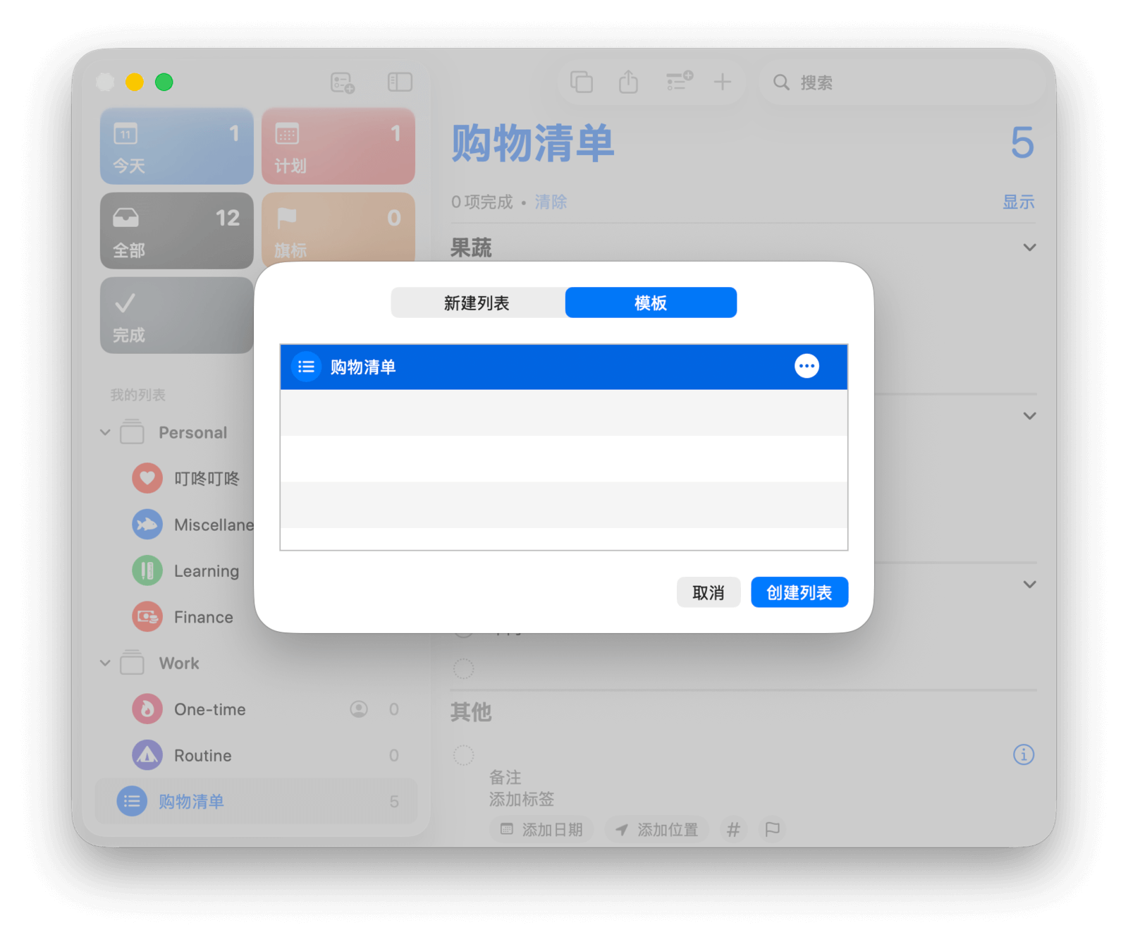 除了从头创建,你还可以通过模板来快速创建列表。首先,选中你想复用的列表,在菜单栏中选择「文件 > 存储为模板...」。之后在「添加列表 > 模板」中就能看到创建好的模板,选择并点击「创建列表」即可直接使用。