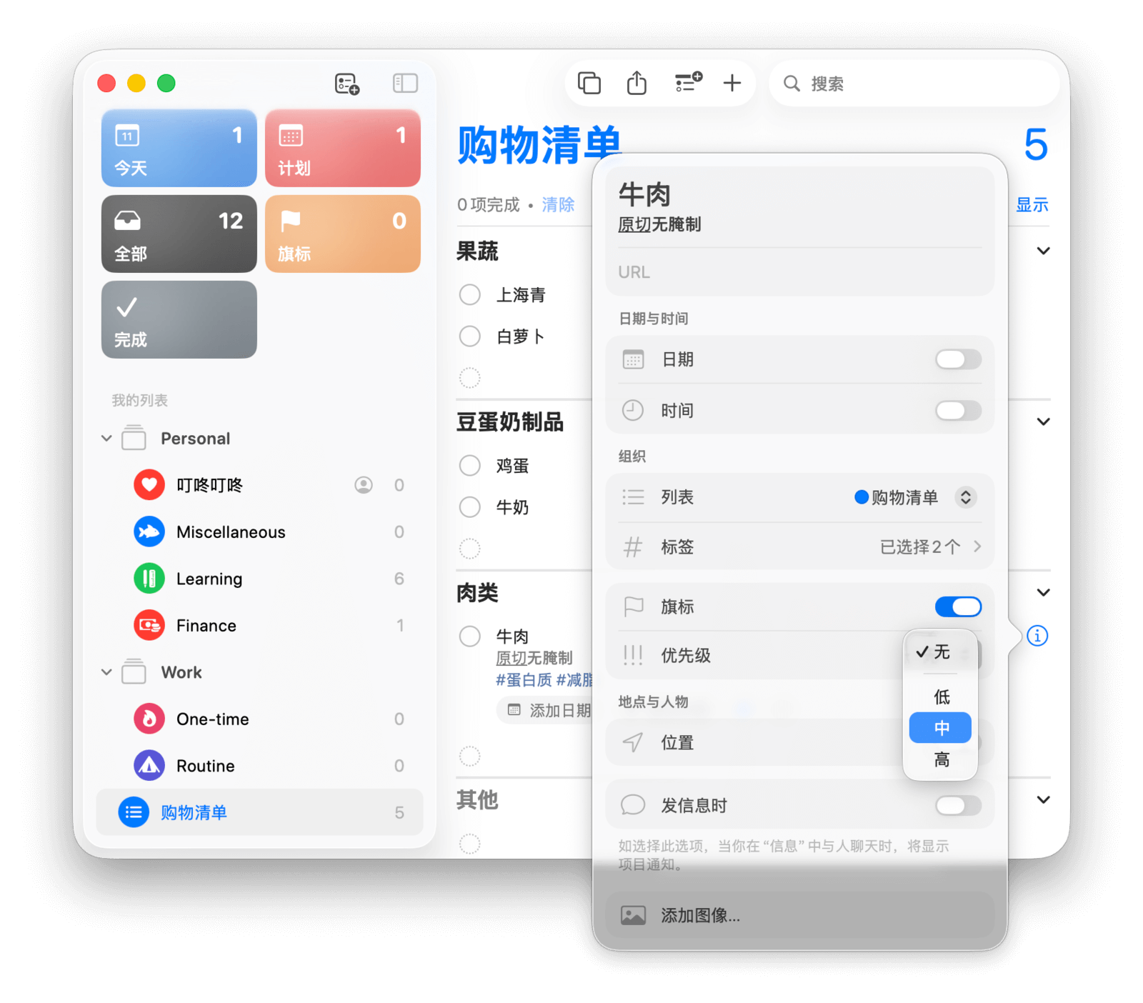 「旗标」和「优先级」可以用来区分任务的重要程度,帮你快速定位关键任务。点击旗帜图标可为任务添加旗标。点击任务右侧的「i」图标,则可在「优先级」一栏为任务指定高、中、低三个等级。买牛奶不算紧急,设为「低优先级」即可。