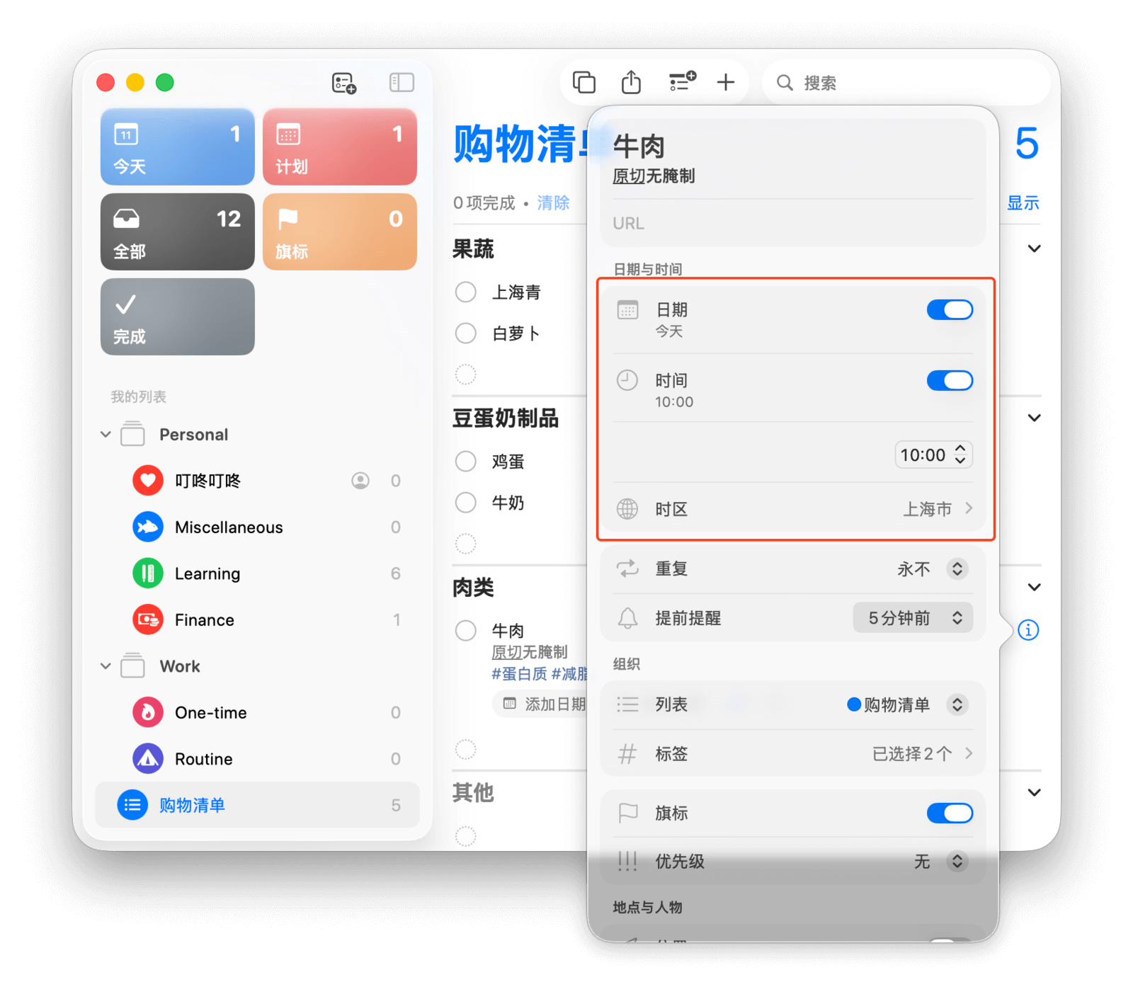 你可以为提醒事项设定标签,方便分类。在「添加标签」一栏,你可以选择已有标签或新建标签。回到买牛奶的例子,你可以给这个任务打上「购物」标签。下次去超市时,只需查看带有「购物」标签的任务,就能确保不会遗漏。