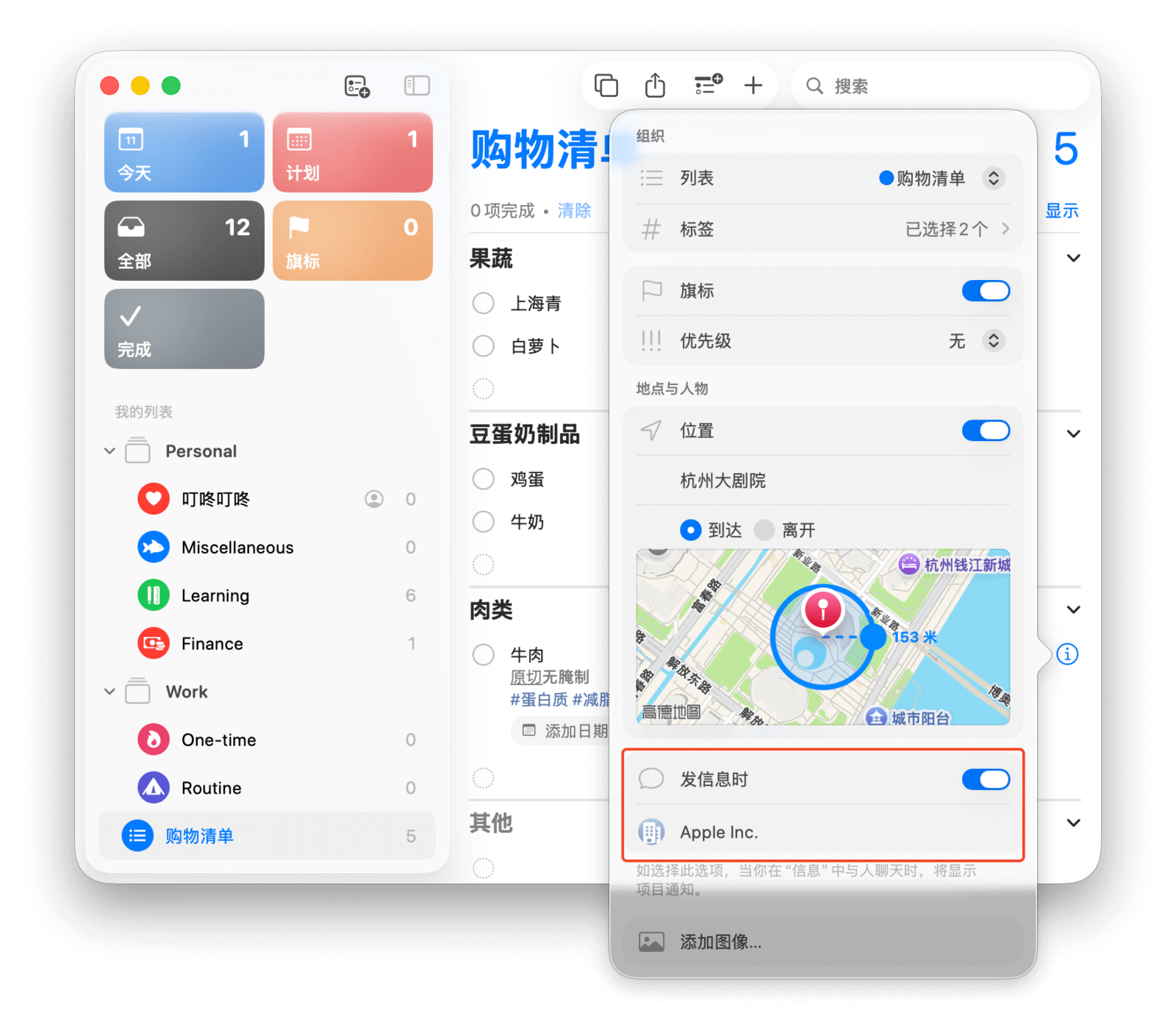 通过「添加位置」并选择一个地点,「提醒事项」就会在你到达或离开该位置时提醒你。你可以在此处选择常去的超市,这样你一到超市就会收到提醒。
