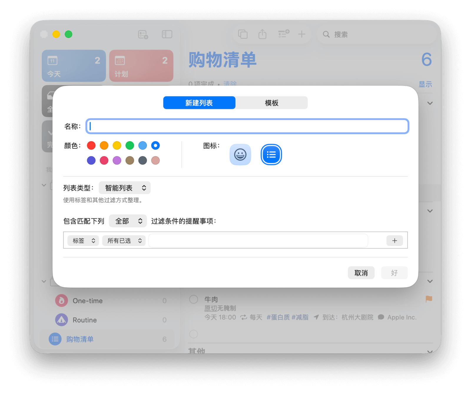 在添加任务前,你首先需要创建列表来为任务分类。打开「提醒事项」,点击「我的列表」侧边栏右上角的「添加列表」按钮,即可打开新建列表窗口。你可以为列表设定合适的名称、颜色和图标,方便区分。