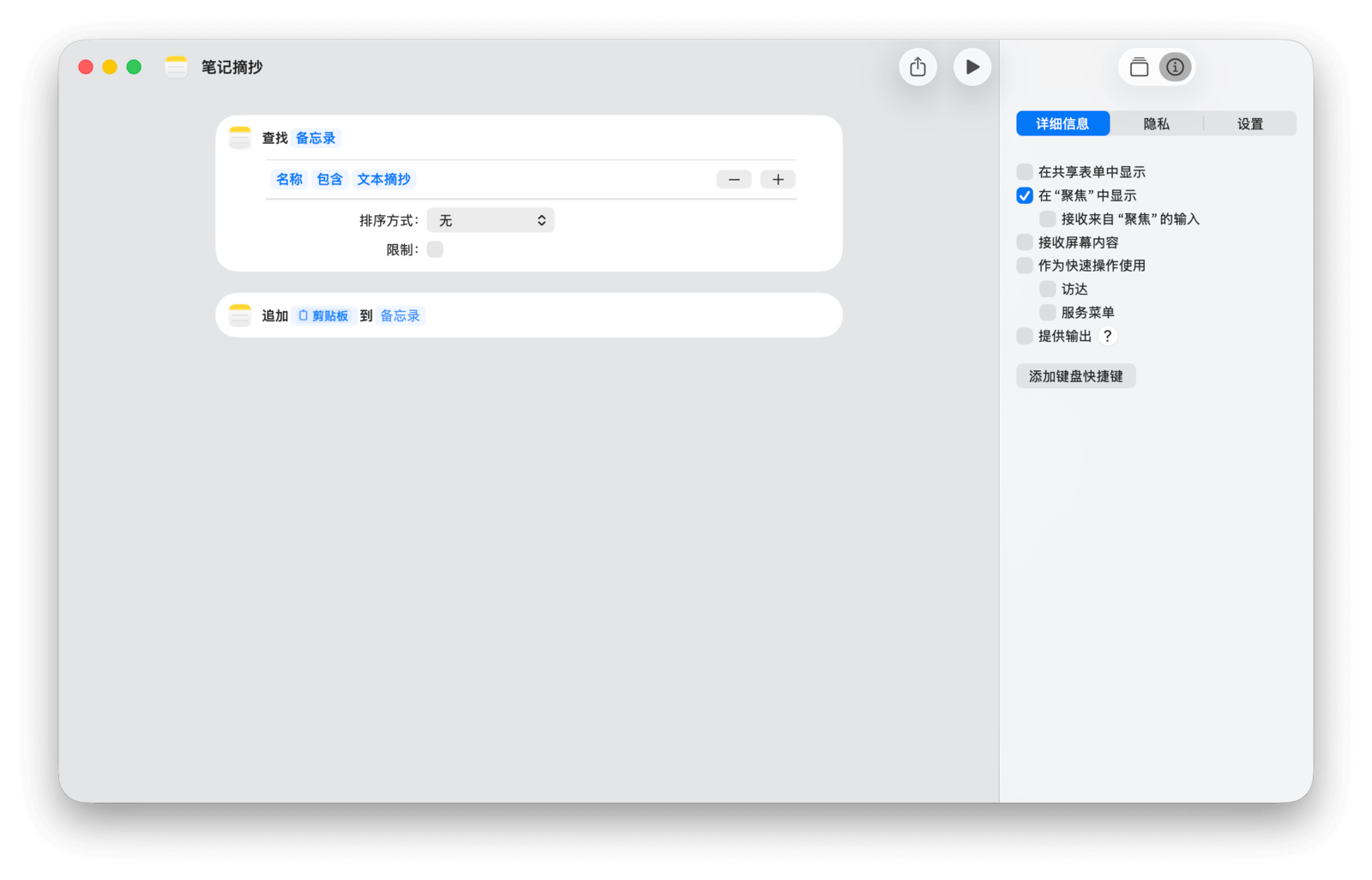 进入任一快捷指令的编辑界面,点击右侧边栏的「i」按钮,在「详细信息」标签页下点击「添加键盘快捷键」,即可为其录制专属快捷键。录制完成后,你就可以通过该快捷键直接运行对应的快捷指令。