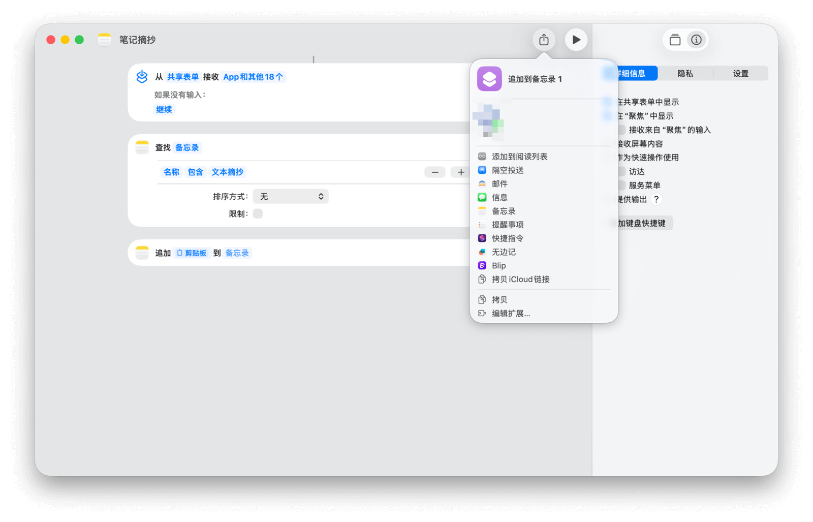 这样,一个简单的「笔记摘抄」快捷指令就完成了。