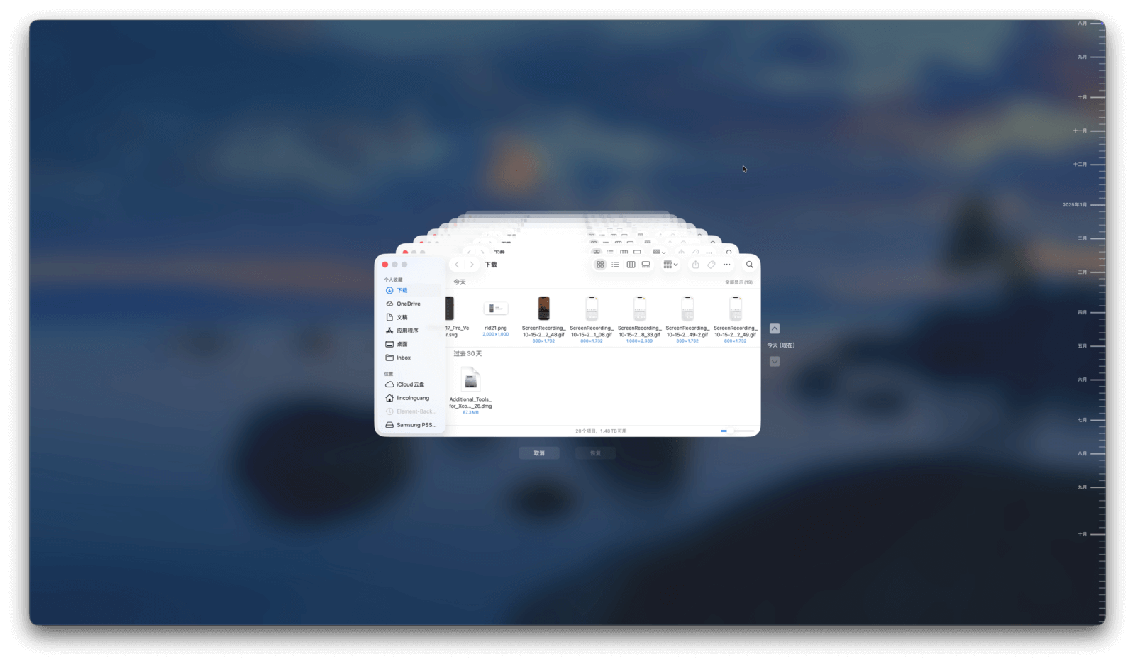 简单来说,「时间机器」App 能以访达窗口的形式,展示任意备份时间点的文件全貌。窗口右侧是一条时间轴,每个刻度都对应一次备份。