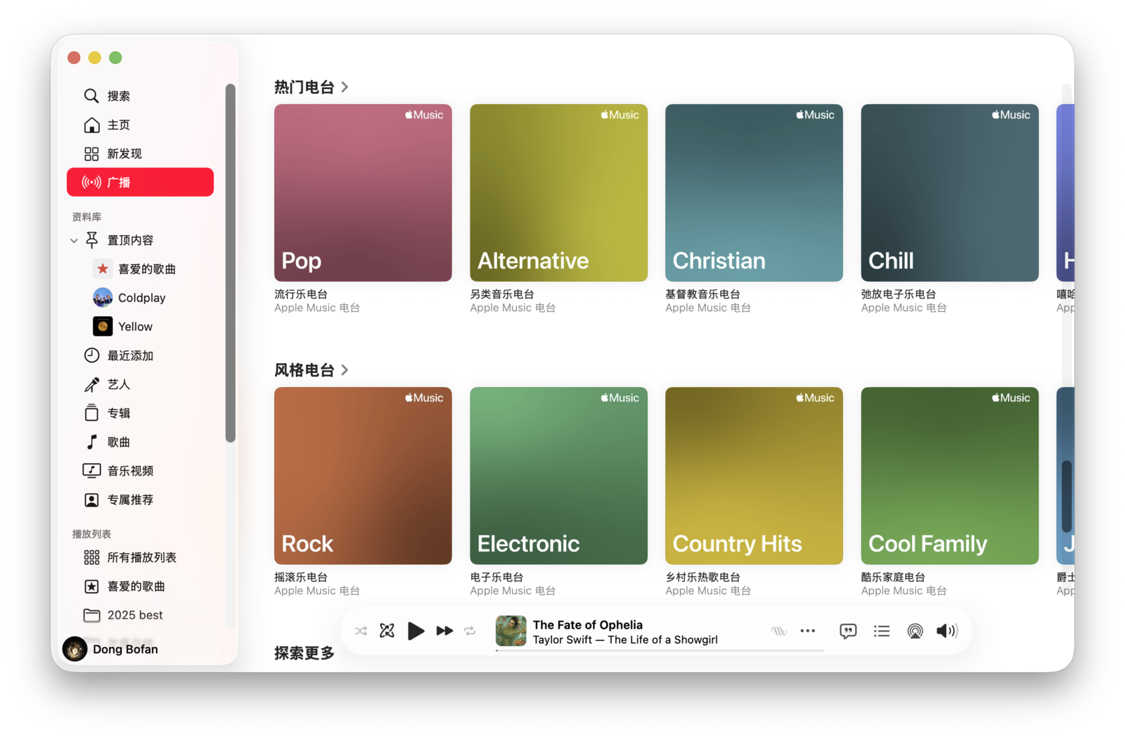 在「广播」里,你可以收听 Apple Music 的直播电台、不同乐坛大咖主持的节目、世界各地的广播电台等。同时,你还可以使用喜爱的音乐创建自己的专属电台。