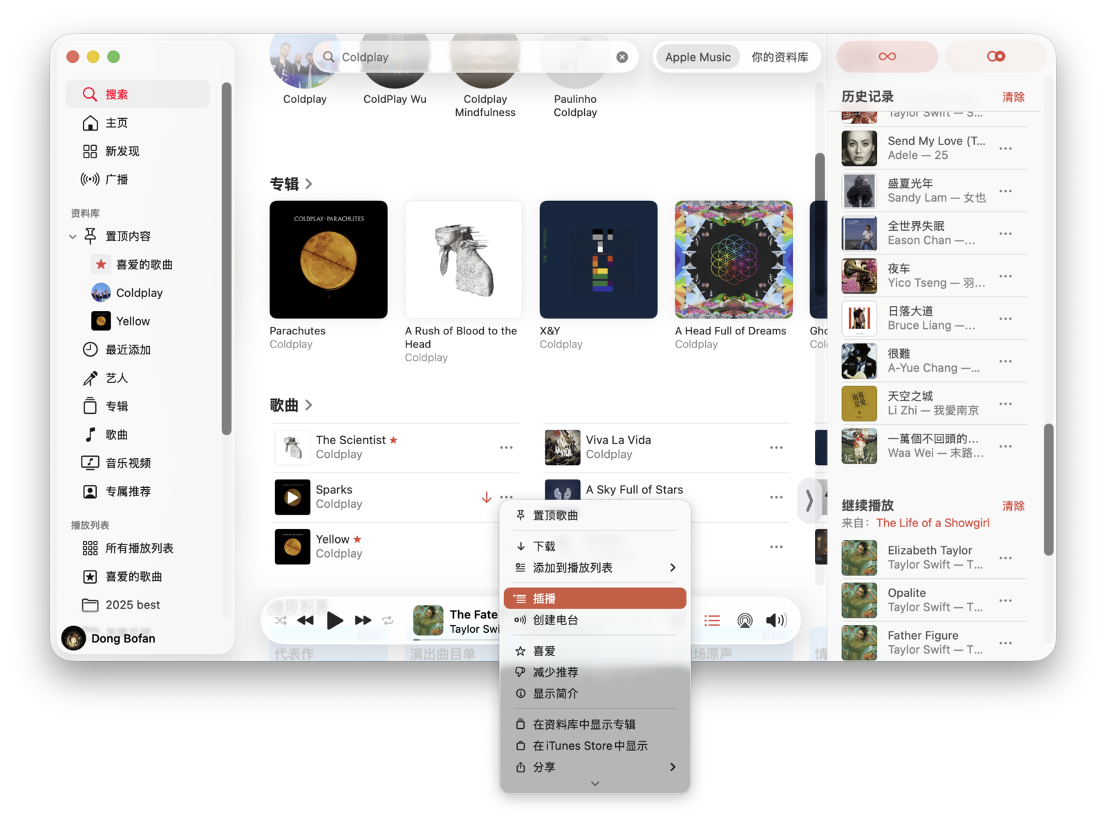 「播放列表」中,包含「待播清单」和「历史记录」。「历史记录」顾名思义,就是你播放过的歌曲;而「待播清单」则显示即将播放的歌曲队列,通常来自当前专辑或歌单。你可以控制播放顺序和模式,还支持「插播」其他歌曲。
