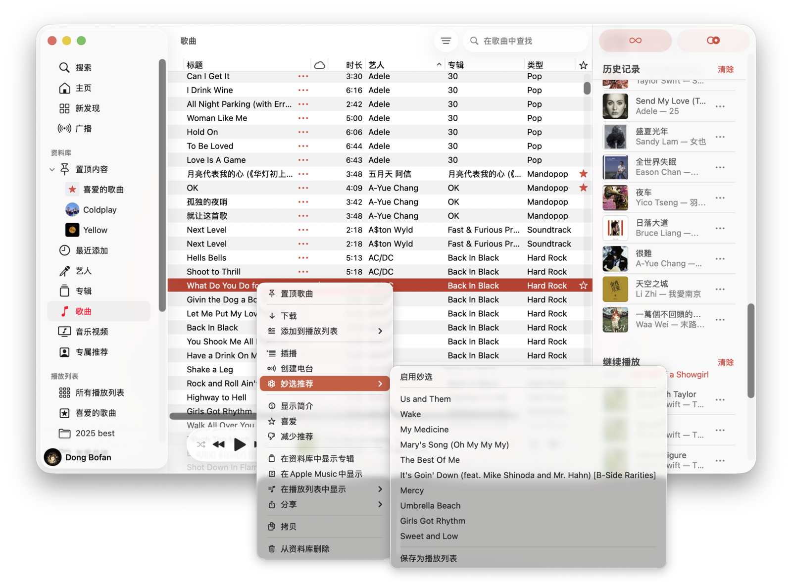 一种是「妙选随机播放」,Apple Music 会选取一首歌并播放与之完美搭配的其他歌曲。只需点击菜单栏的「控制 > 妙选随机播放」或使用快捷键「Option + 空格键」即可开启。