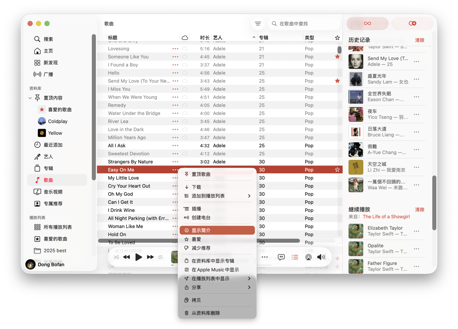 在 Mac 上使用 Apple Music 时,遇到喜欢的歌曲、专辑或歌单,都可以点击旁边的「...」按钮,选择「添加到资料库」,将其加入「歌曲」列表。