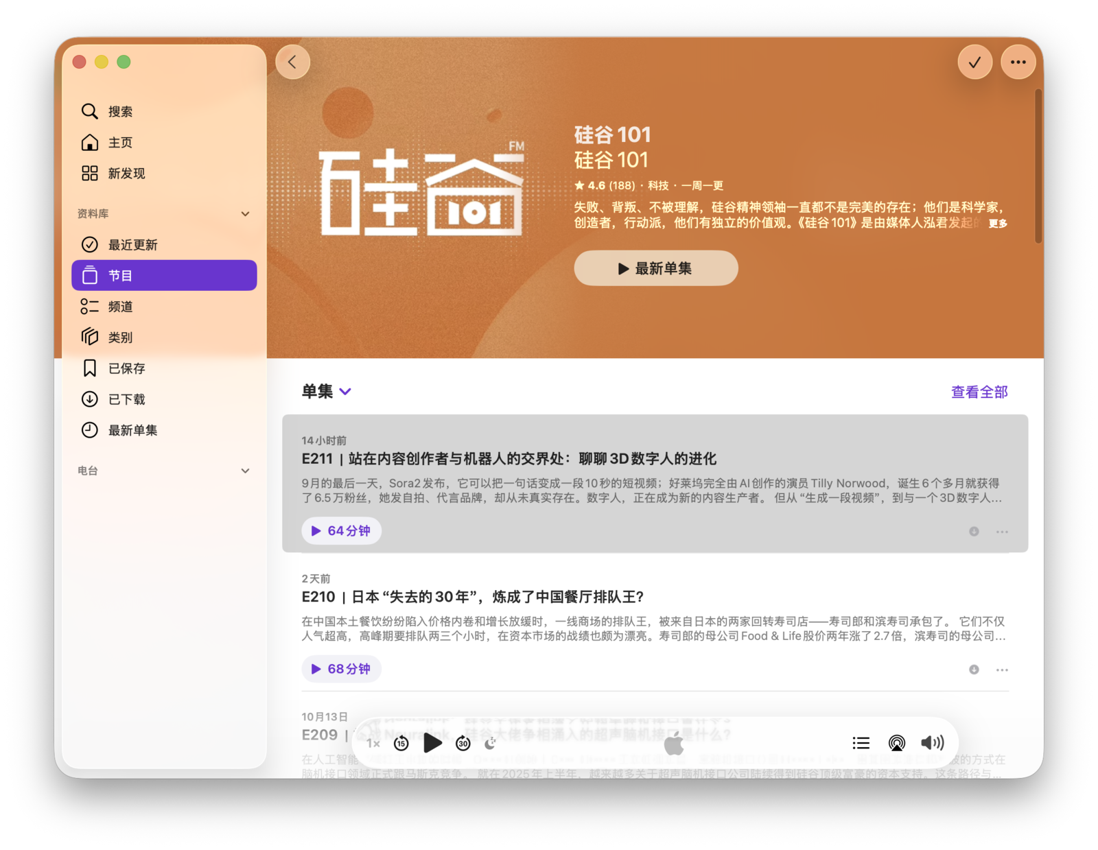 关注一档播客节目最常见的方法是直接点击播客制作者提供的链接。此时,macOS 系统会自动跳转到「播客」App 并打开节目详情页,点击「+关注」按钮就能将该播客添加到资料库。如果在「设置 > 通用」中开启「同步资料库」,你关注的节目将在所有登录了相同 iCloud 账号的设备间同步。