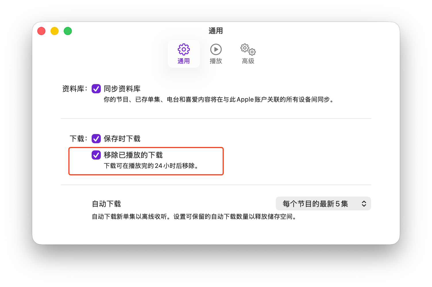 为避免下载的播客单集占用过多存储空间,可以在「设置 > 通用」的「下载」处启用「移除已播放的下载项」。开启后,已听完的播客单集会在 24 小时后被系统自动删除。