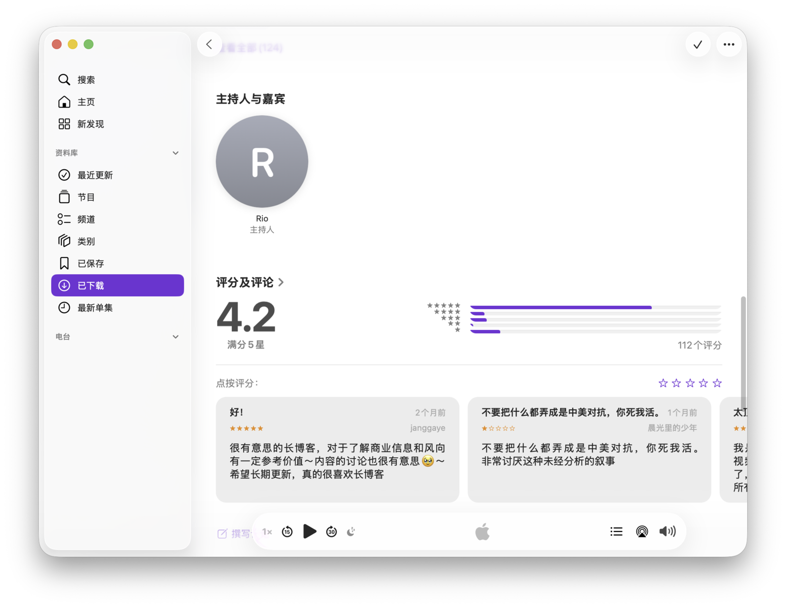 在播客节目介绍的下方,还有主持人、嘉宾、评分等更多信息,类似于 App Store 中的应用详情页。