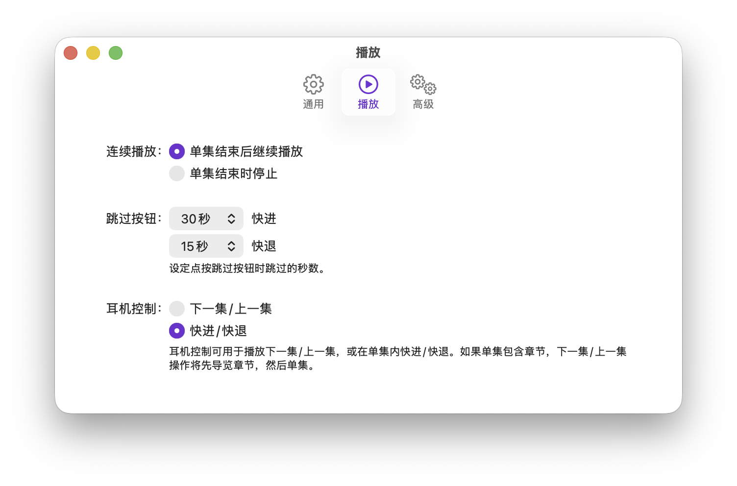 如果你的 Mac 连接了耳机等外部设备,按下设备上的「上一曲」或「下一曲」按钮也可以控制播客播放。要设定此时是切换单集还是快进/快退,可以前往「设置 > 播放」,在「耳机控制」一节中更改设定。
