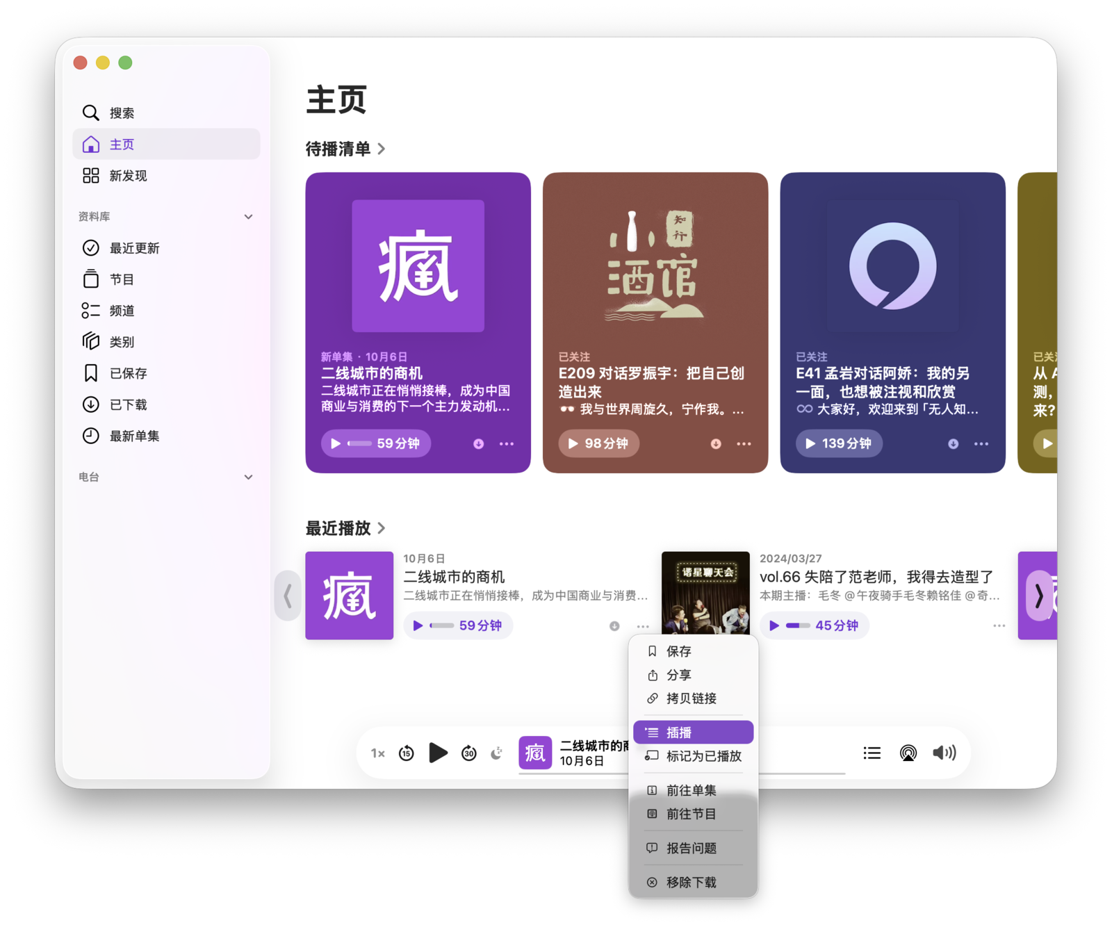 要查看已关注播客的最新单集,可以前往「播客」App 侧边栏的「资料库」面板,并点击「最近更新」。