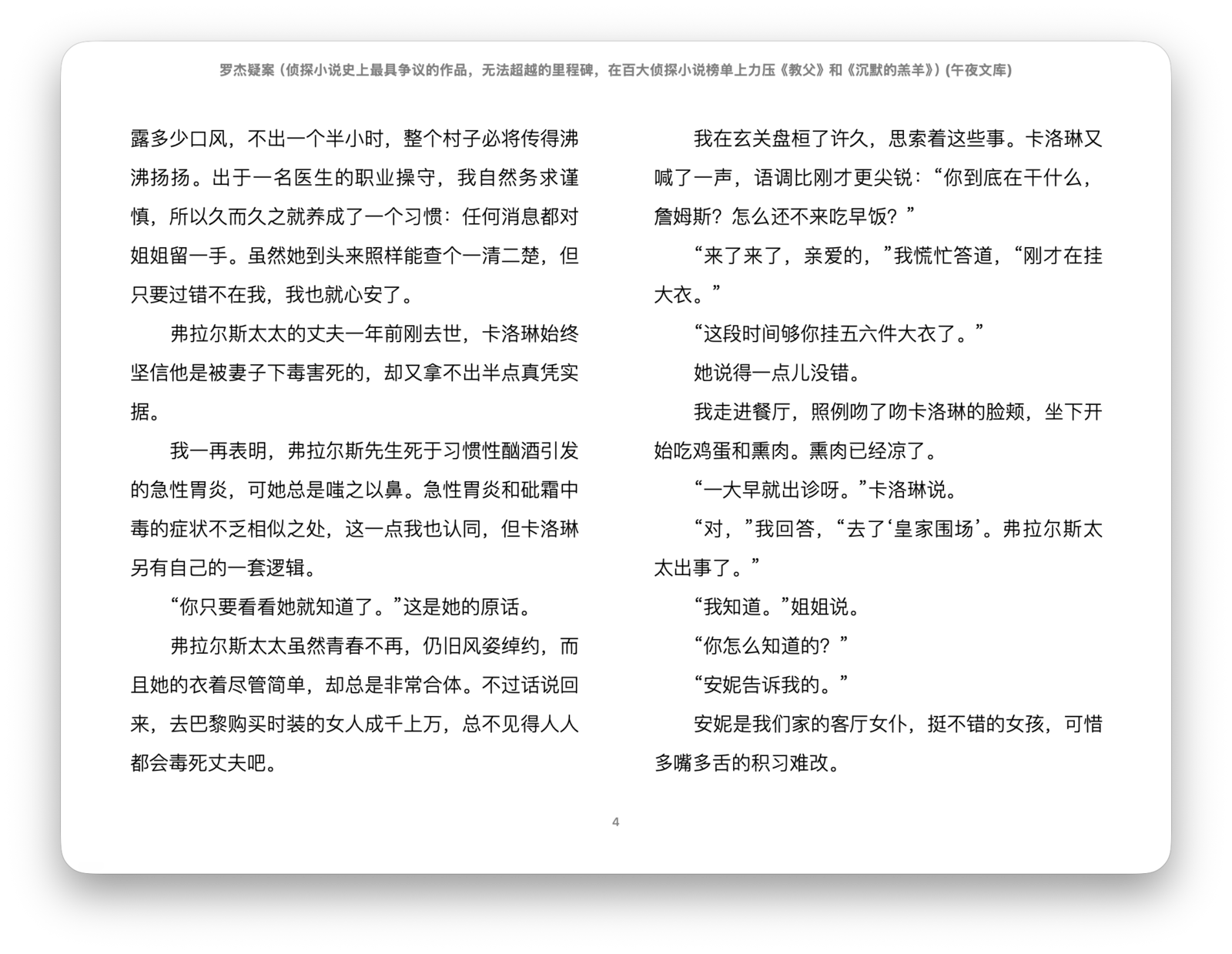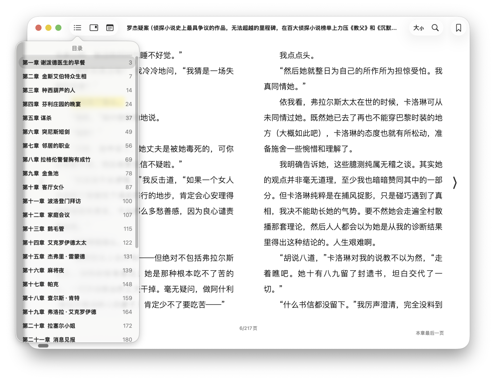阅读 EPUB 格式的电子书时,你会感觉像在阅读一本纸质书。界面上只显示书名、页码等必要信息,只有当鼠标移动到窗口顶部时才会显示工具栏,为你提供沉浸式的阅读环境。