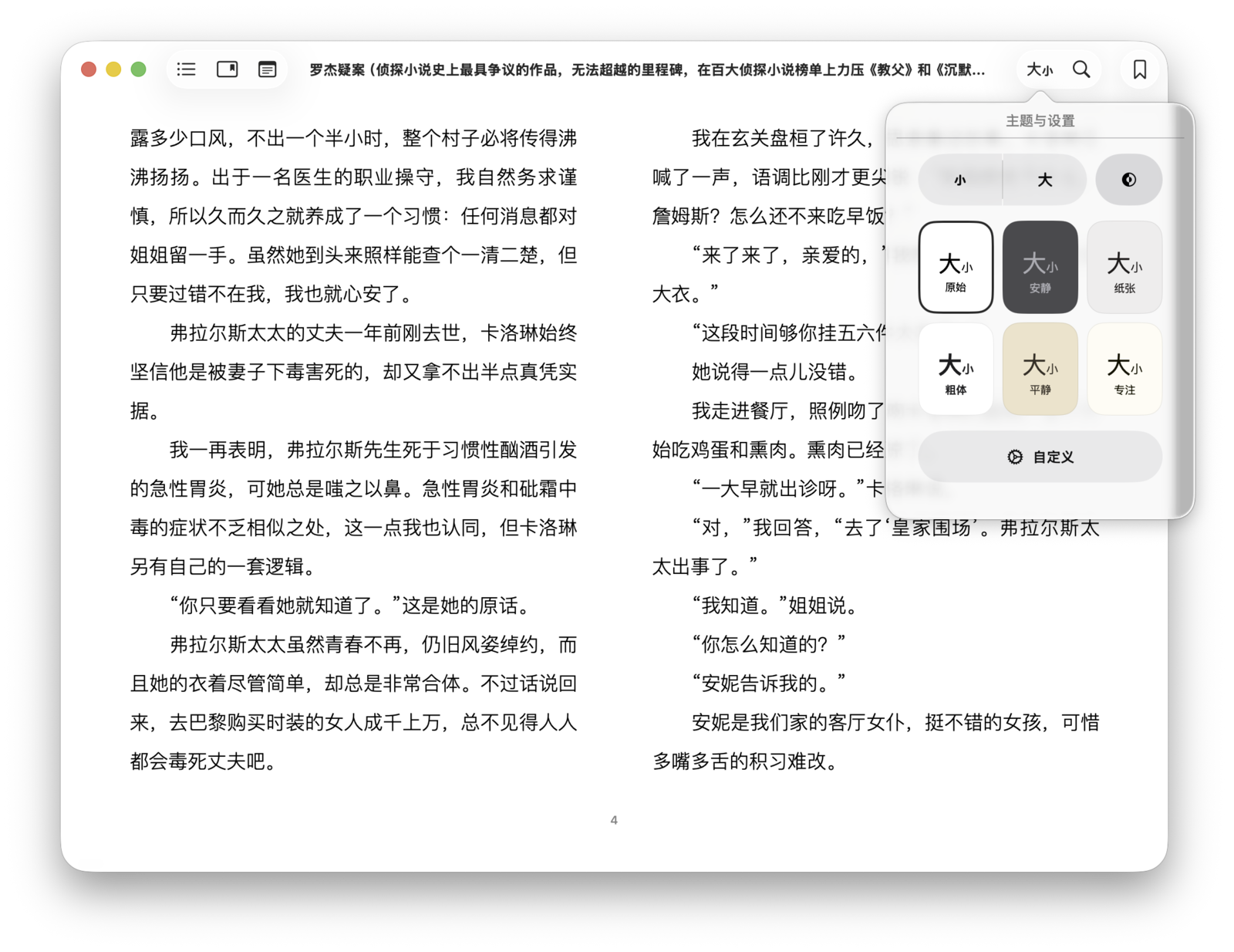 你可以通过右上角的「Aa」按钮自定义阅读界面,其中包括屏幕亮度、字体大小、字体和背景主题。