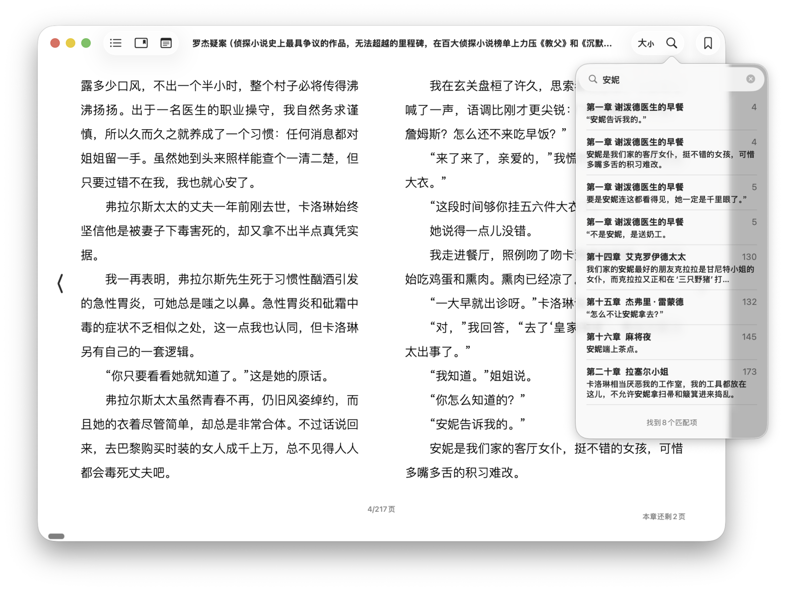 点击右上角的「放大镜」按钮可以搜索全文。值得一提的是,这里不仅可以搜索文字,也可以直接输入页码来快速跳转。不过要注意,总页码会根据你的字体大小和屏幕尺寸而变化(例如,iPhone 屏幕较小,显示的页数会更多)。