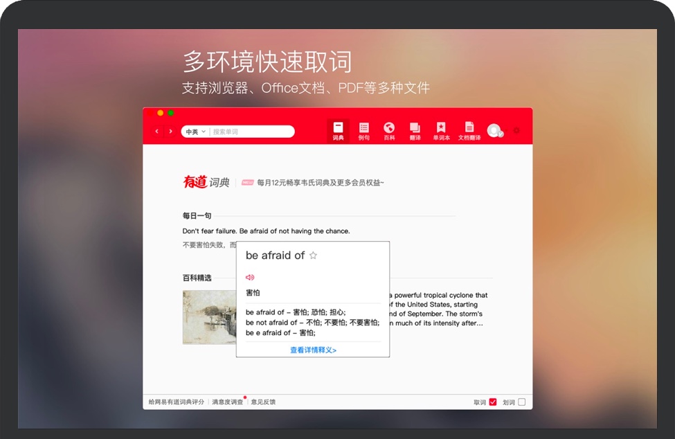 网易词典 for Mac 全程:网易有道词典;是一款英语、日语、韩语、法语免费全能查词翻译软件。网易词典在多年来致力于为用户提供更优质的翻译服务,针对Mac平台特性,我们特别推出全新的版本,更符合Mac用户翻译使用习惯。网易词典发布多年以来,成为Mac系统下必备的词典软件,在同类软件排行位居前列。