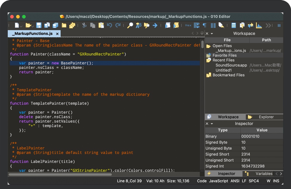 010 Editor for Mac 旨在成为能够编辑和解析任何二进制文件的专业文本编辑器和十六进制编辑器。文件在中央区域显示为一系列文本字符或十六进制字节。010 Editor 最强大的功能是能够将二进制文件解析为可以理解的数据结构。解析由二进制模板完成,显示在右上角,运行模板的结果显示在十六进制编辑器下方的模板结果面板中。