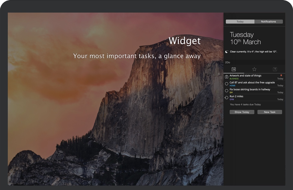 •使用您最喜欢的同步方法通过快速可靠的推送同步与运行 2Do 的多台 Mac 和移动设备保持同步:Dropbox、Reminders (CalDAV)、3rd Party CalDAV 服务器(iCal、Fruux、ownCloud 等)或Toodledo。