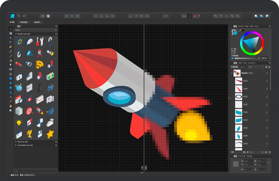 一键切换全功能矢量与栅格工作空间。向插画中添加栅格笔刷纹理、编辑图标上的单个像素、为清新的矢量图遮盖和增加颗粒、封装和剪切像素图层等等,真正的创作自由尽在您的指尖!
