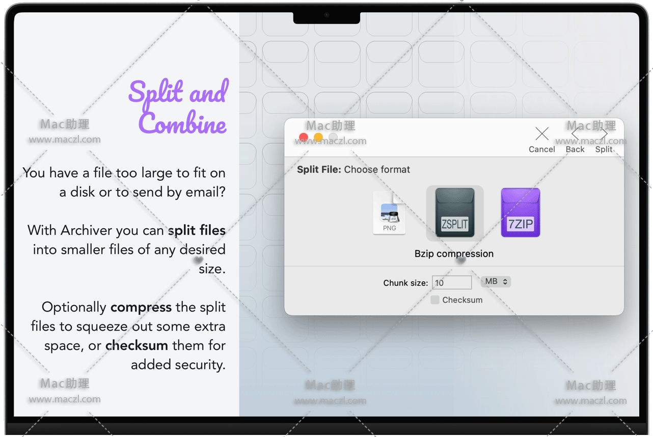 没问题!使用Archiver,您只需单击几下即可拆分和合并文件。此外,Archiver还允许您创建拆分档案。