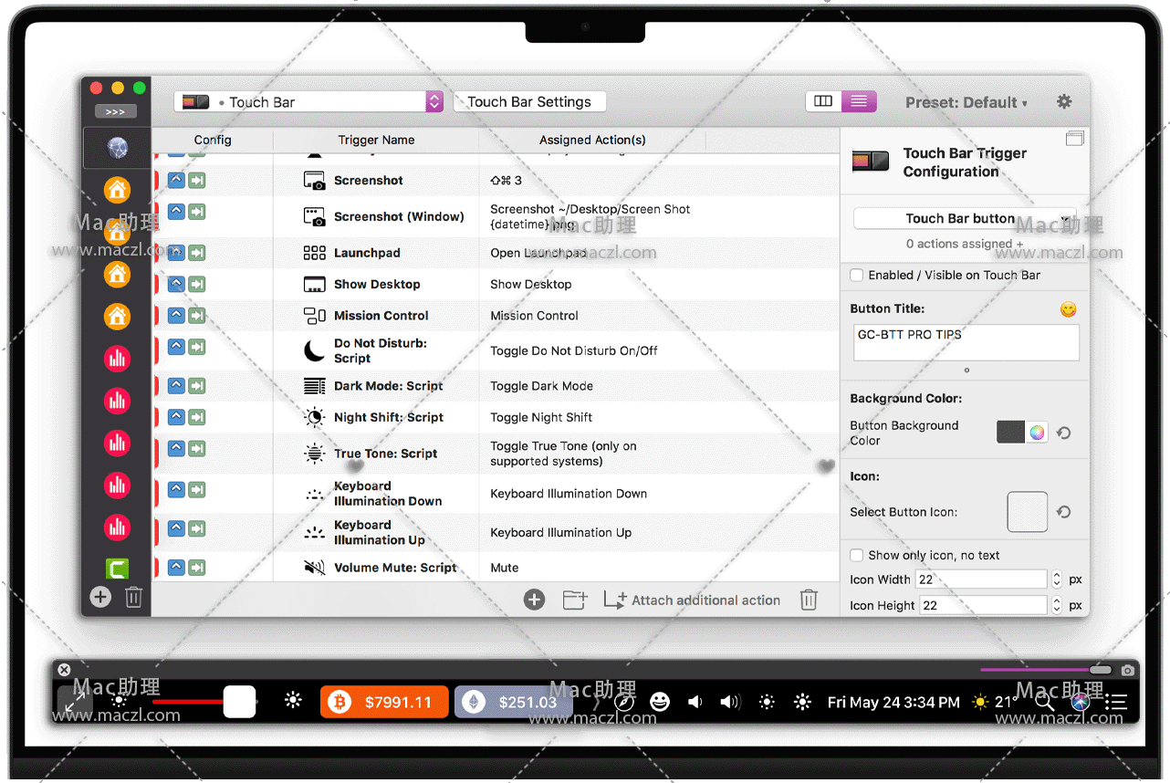 BetterTouchTool 让您能够按照自己的想法重新定义触控栏。从精确编辑现有设置到创建新的功能按钮,甚至定义元素之间的间距,您的触控栏将能够包含独特的触发器,完美契合您的工作方式。