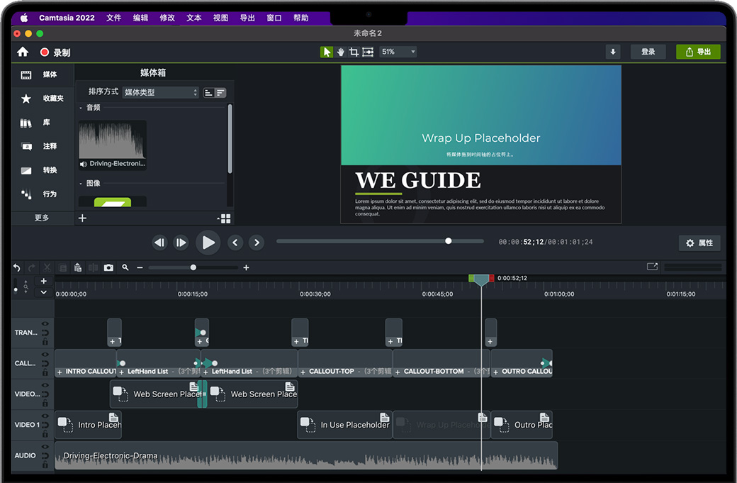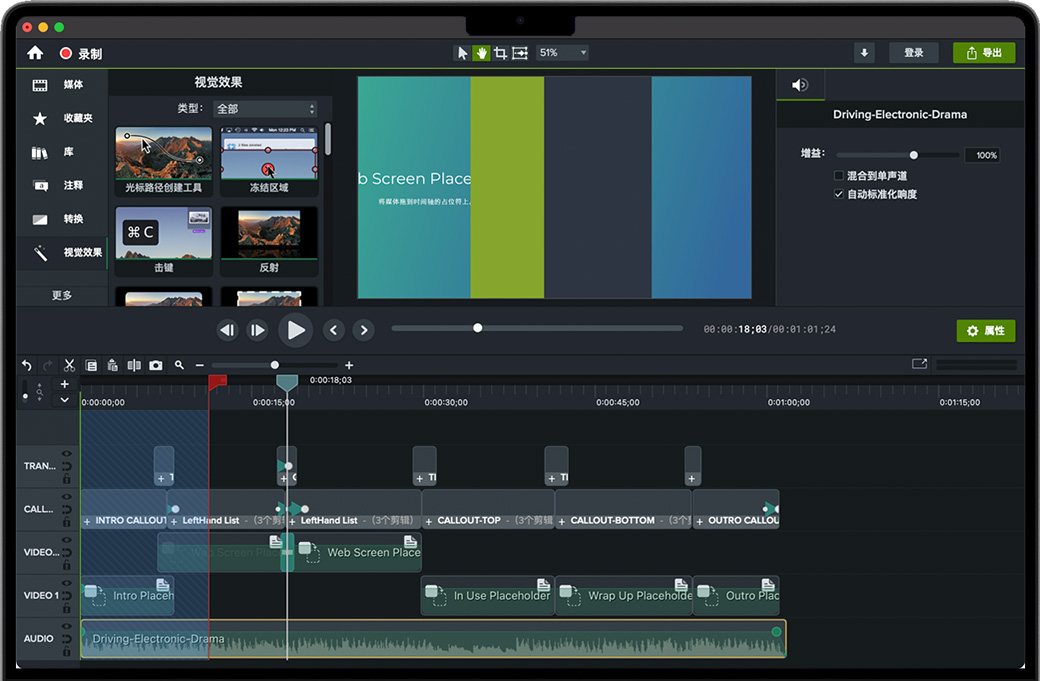音频效果减少背景噪音、平衡音频电平、添加音频点、调整音高和增益等等,以确保视频中的高质量音频。 | 模板和主题比以往更容易 - 使用 Camtasia 的新视频模板创建您需要的视频。或者,通过创建自己的主题来保持品牌形象,以在视频中保持一致的企业外观。 | 音频/音乐从我们的免版税音乐和音效库中选择插入到您的录音中。或者,使用麦克风、计算机中的声音或导入剪辑来录制和编辑音频剪辑,以获得完美的视频音频。 |