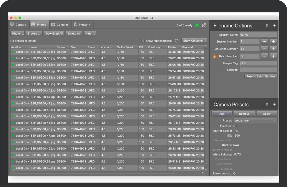 CaptureGRID使您可以精确控制照片的处理方式。拍摄后,可以将照片保存到存储卡中,自动下载到计算机中,或两者都保存。