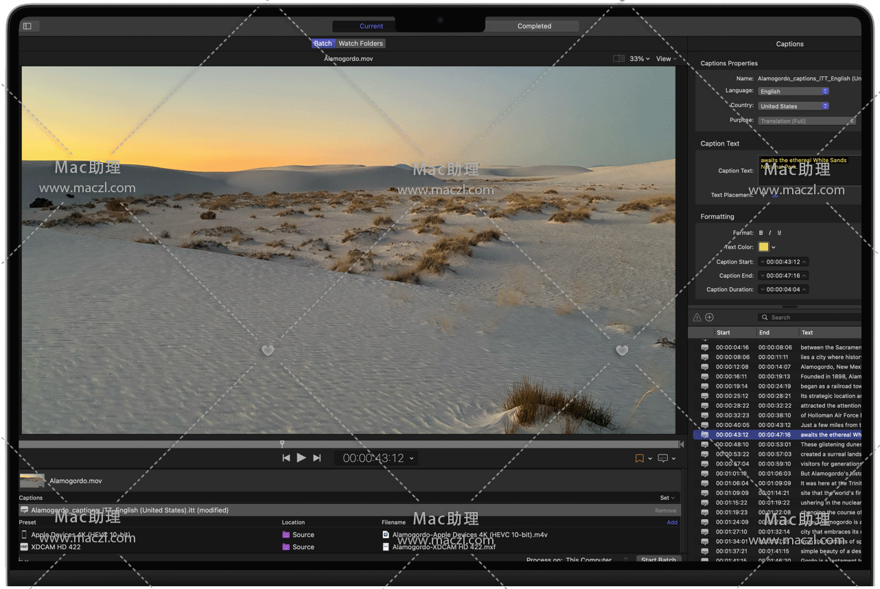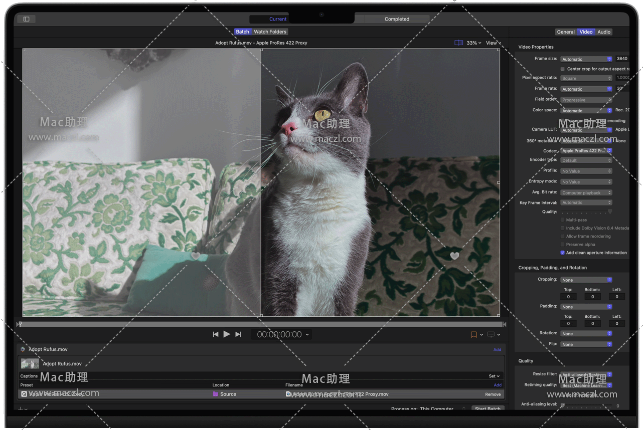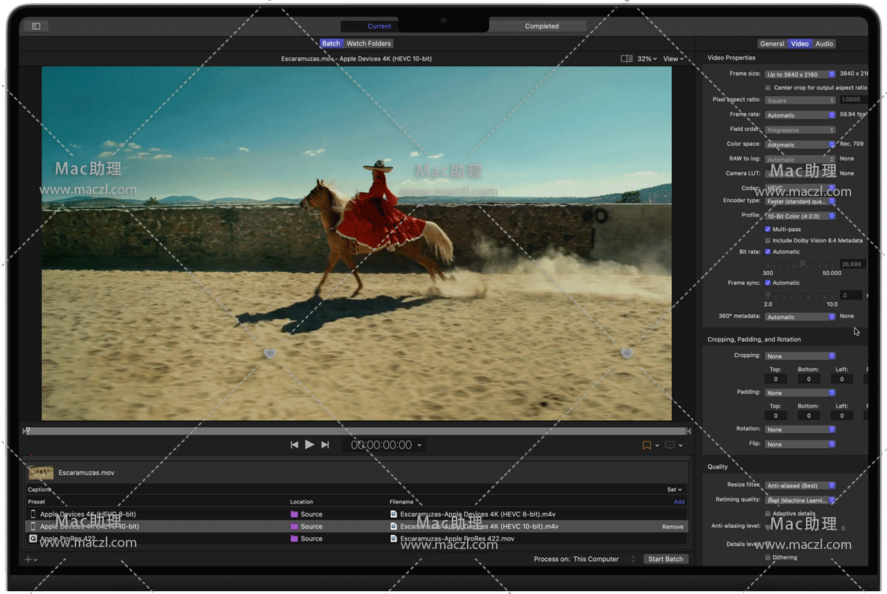 - 编码成各种符合行业标准的格式,包括 HEVC、MV-HEVC、H.264、MXF 和 ProRes
