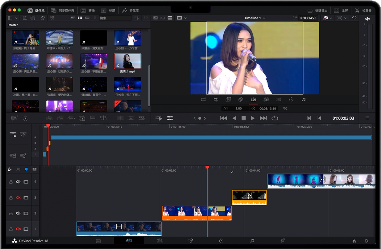 无论是离线剪辑还是在线精编,均能完美胜任。您可使用各种剪辑和修剪工具、堆叠和选项卡式时间线、多机位、隐藏式字幕和字幕工具、屏幕注释、更快的项目加载速度、2D 和 3D 字幕模板以及数十项其他新功能!