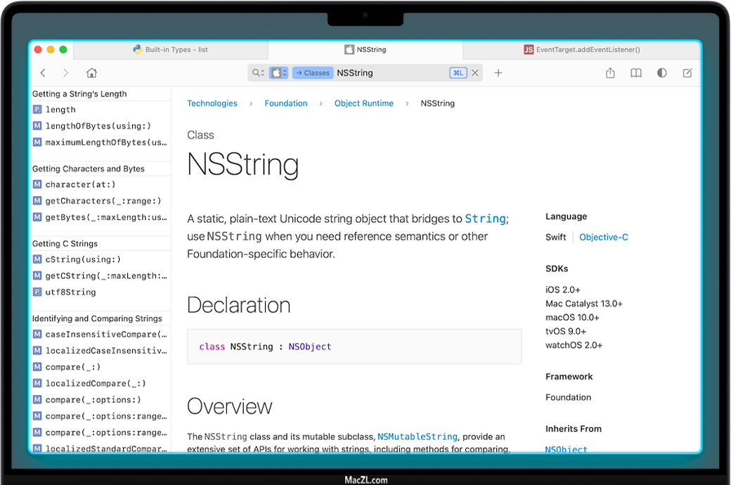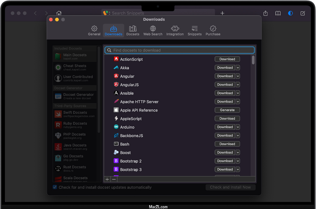 Dash随附200多个离线文档集。您可以选择要下载的文档集,其余的由Dash负责,并确保它们保持最新状态。您还可以生成自己的文档集,请求文档集或从第三方来源下载文档集。