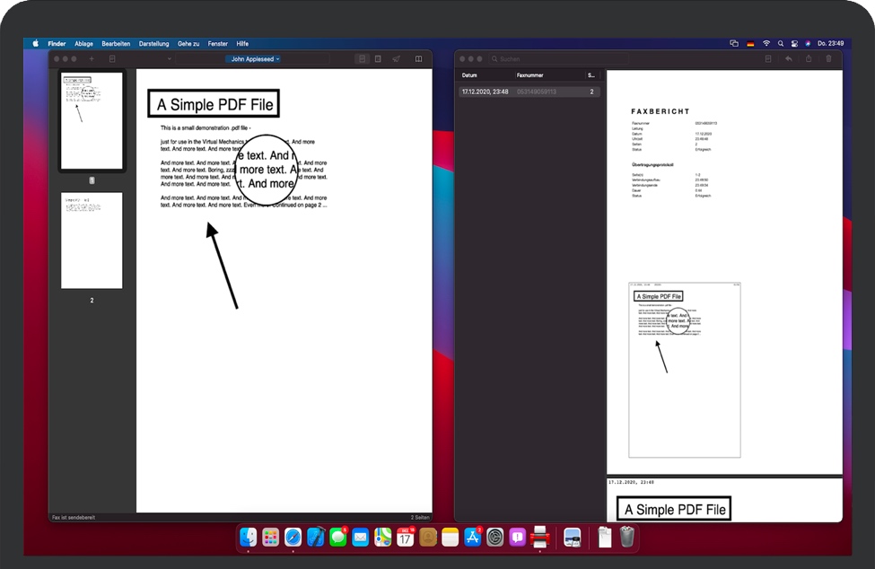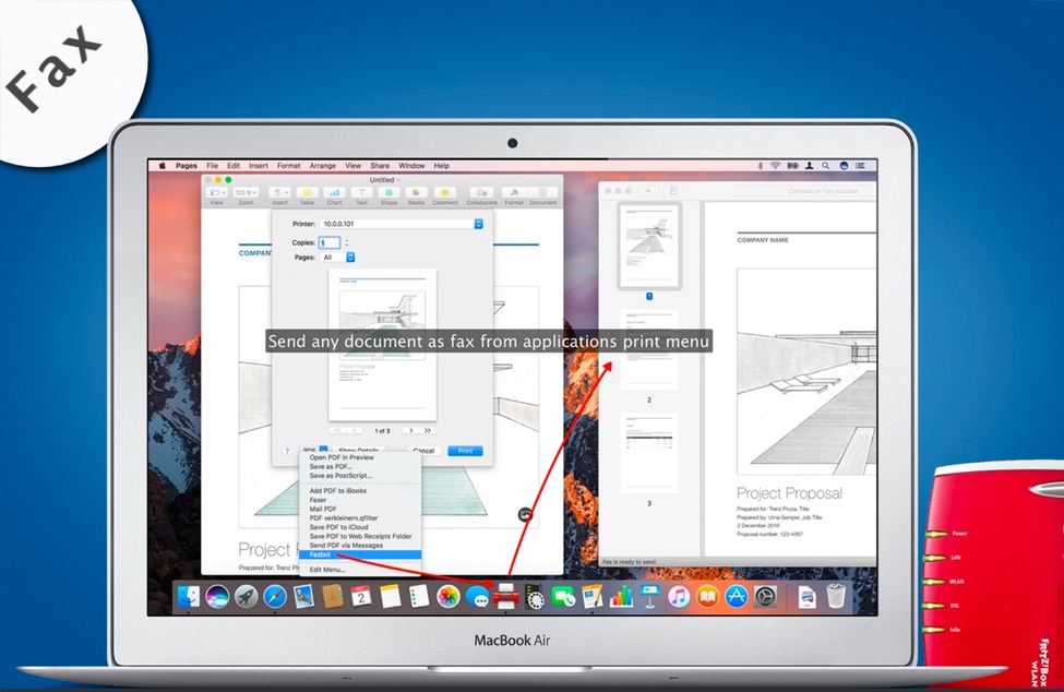 Faxbot也提供AppleScript支持。您可以使用AppleScript使用可选的收件人传真号码将一个或多个PDF,PNG或JPEG文档提交给Faxbot。此外,您可以自动执行发送过程。