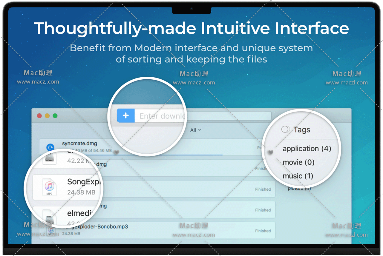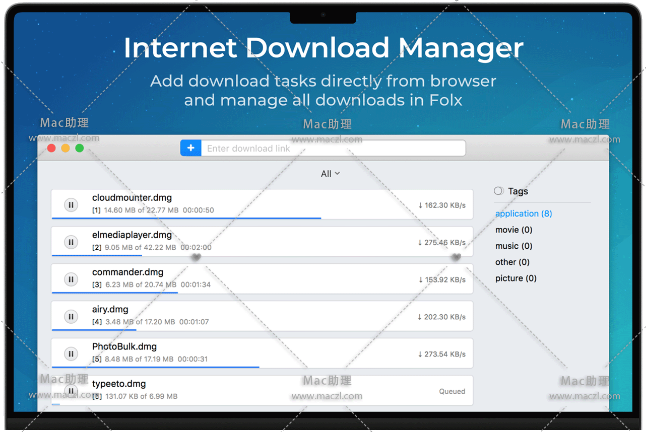 除了从torrent跟踪器中下载文件之外,Folx还使您可以使用磁铁链接进行下载。