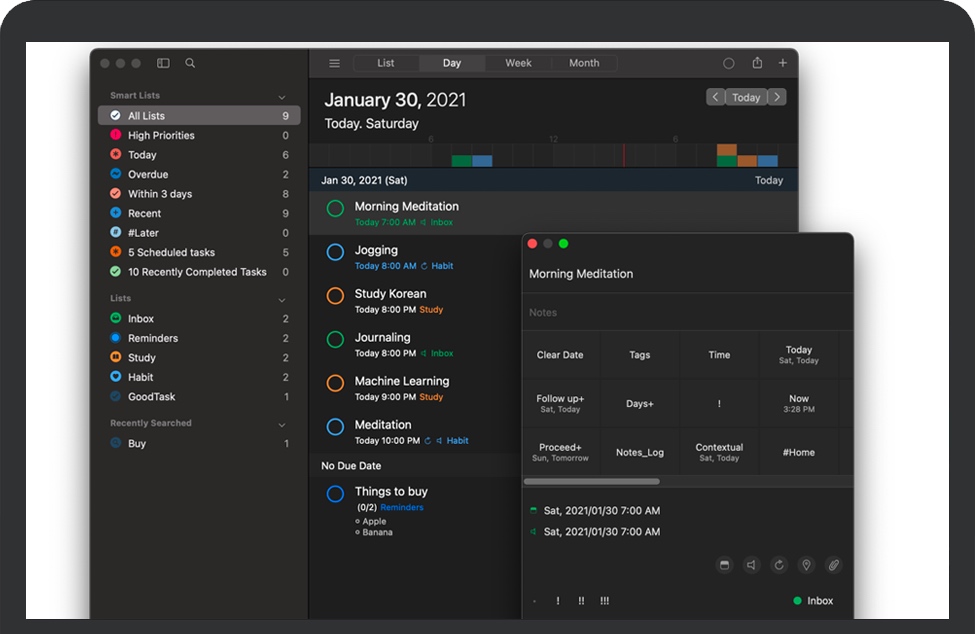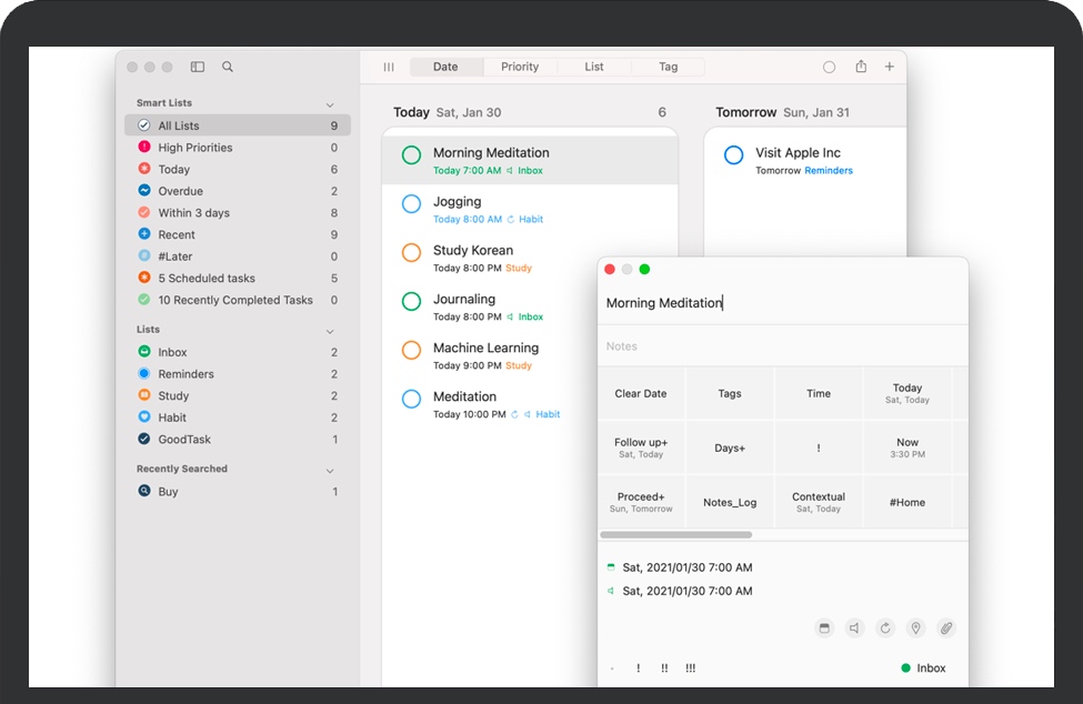 GoodTask for Mac 是一款基于Apple提醒和日历、功能强大的任务/项目管理应用程序。它既可以用作简单的待办事项检查列表,也可以用作复杂的项目管理工具,帮助完成重大项目。GoodTask让您通过各种不同的视角来观看自己关注且需要完成的事务。有了GoodTask,您可以更好地管理自己的任务、项目,甚至是生活。