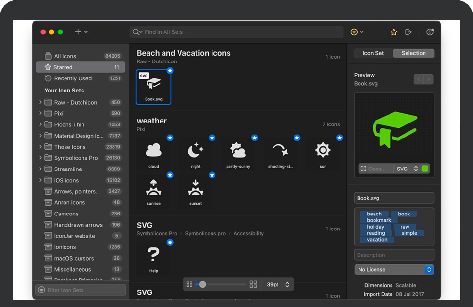 IconJar for Mac 是一款苹果电脑上优秀的图标素材管理工具,可以帮助我们管理和查找图标图片素材,可以搜索、预览、使用和导出图标的应用。帮助设计师管理图标素材,提高工作效率。