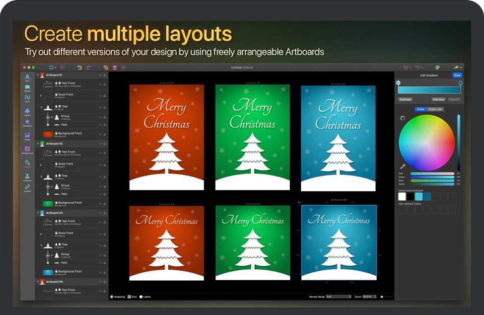 是否需要查看多种变体的图形或徽标草稿?然后使用Artboards在一个文档中创建多个工作区。不确定要选择蓝色还是红色的图形?徽标帮助您将它们并排比较。您还可以针对不同目的对齐图形–创建缩小版本以用于信头纸,创建较大版本的信纸用于海报,以及提供详细图形的杂志封面。