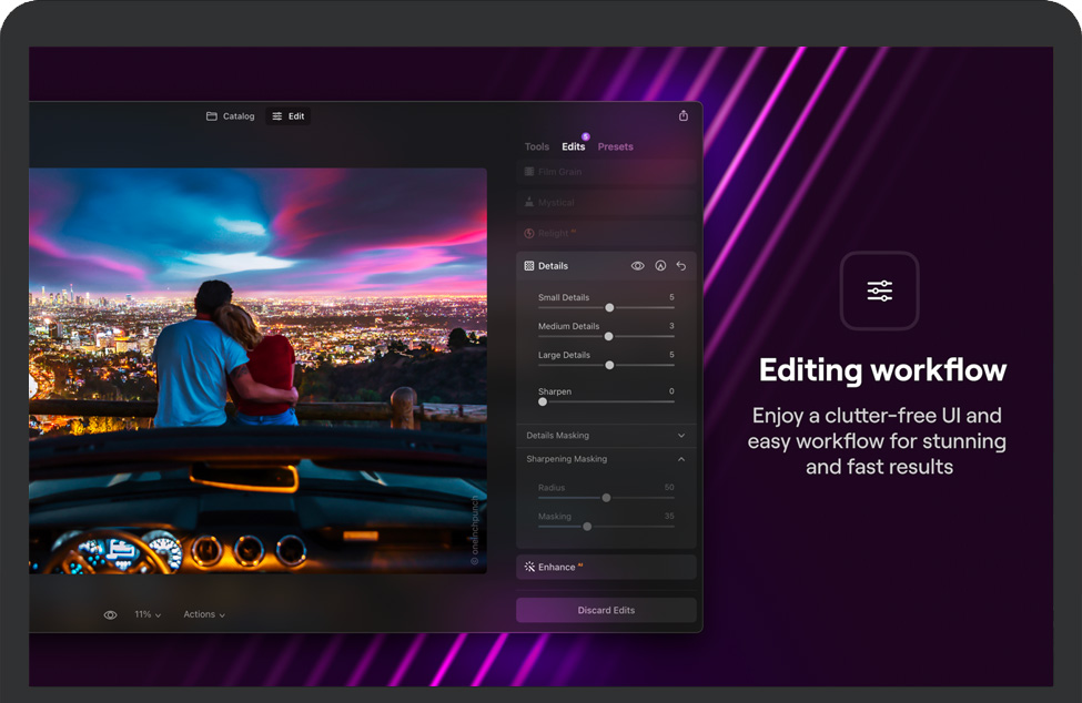 依靠具有 20 多种独特照片效果和编辑功能的 AI 照片编辑器。您可以通过单击来增强风景、修饰肖像、删除不需要的细节,甚至可以通过完整的场景重新照明来改变天空。